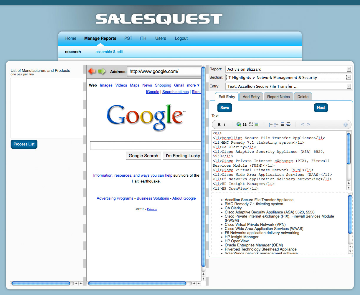 SalesQuest Apps developed for internal comnpany use. Includes a proprietary search engine using Bing, Google, and Yahoo, as well as a custom report manager interface.
